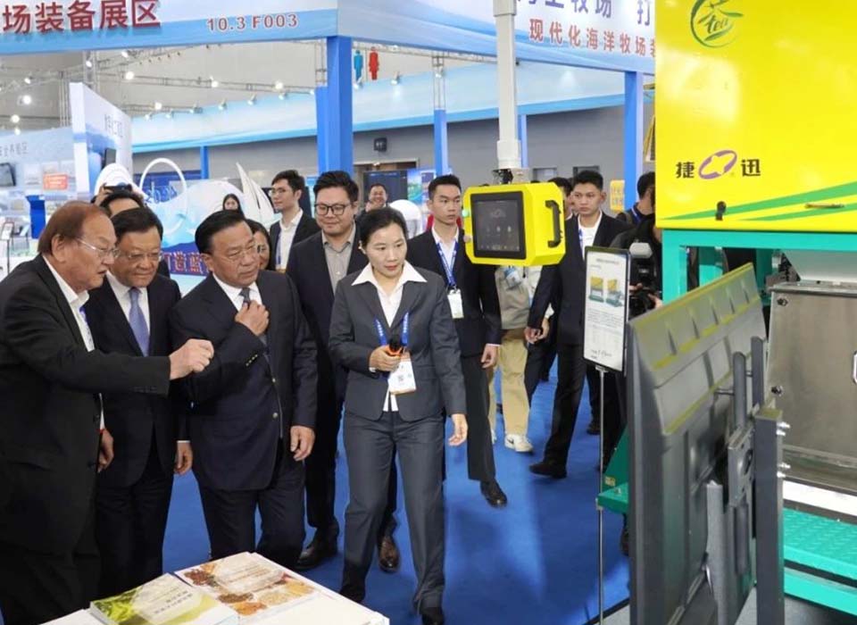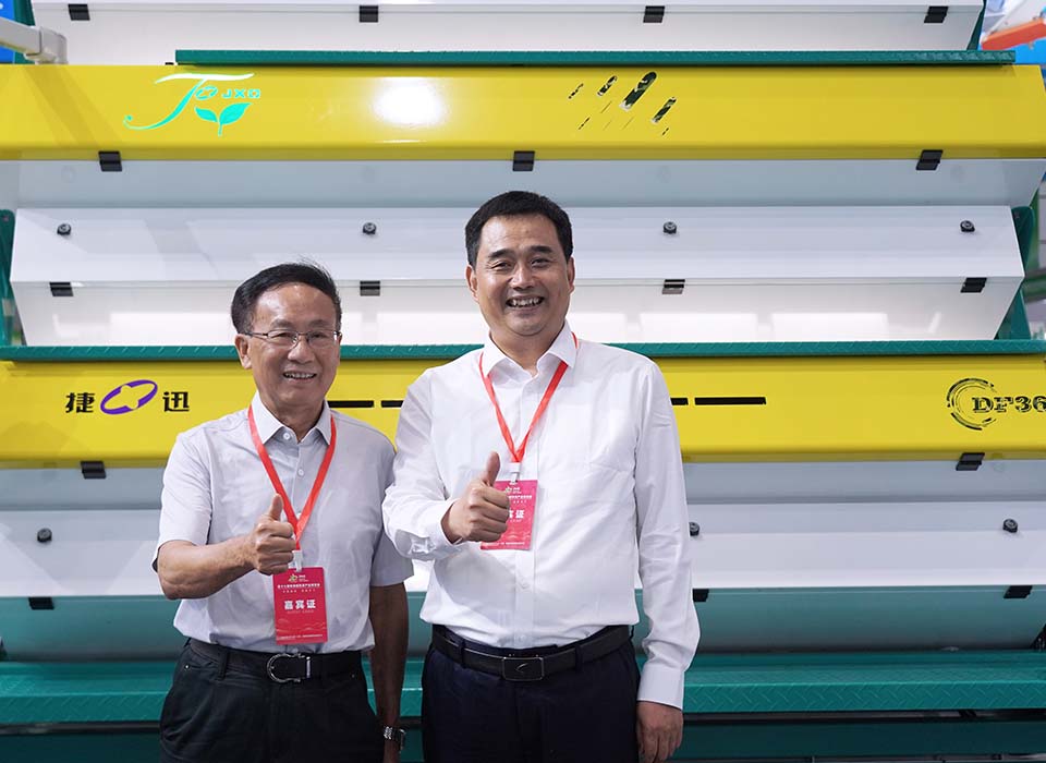 中国工程院院士罗锡文(左一)向农业农村部部长韩俊(左三)、广东省省长王伟中(左二)介绍BBIN电子鲜叶质选技术发展情况
